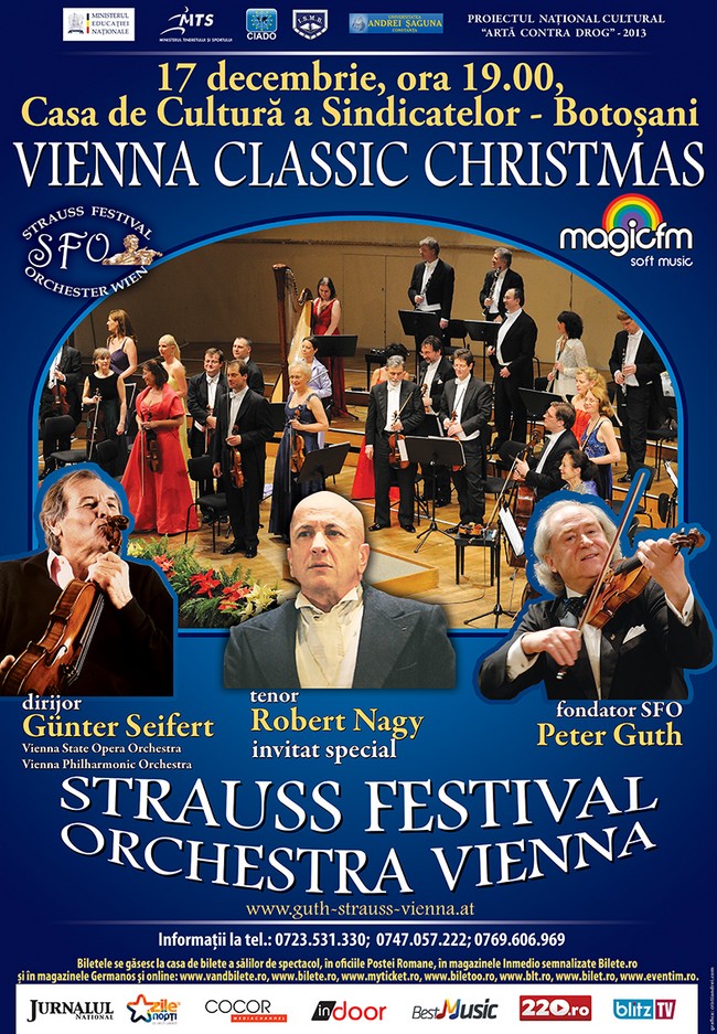 Strauss Festival Orchestra Vienna prezinta, pentru al cincilea an consecutiv in Romania, spectacolul Vienna Classic Christmas. Ansamblul vienez, infiintat in 1978 de legendarul dirijor Peter Guth, a primit in randurile sale de-a lungul anilor pe cei mai talentati artisti, pastrandu-si, astfel, suprematia intre orchestrele de acelasi gen. De cinci ani, publicul din Romania intra in […]