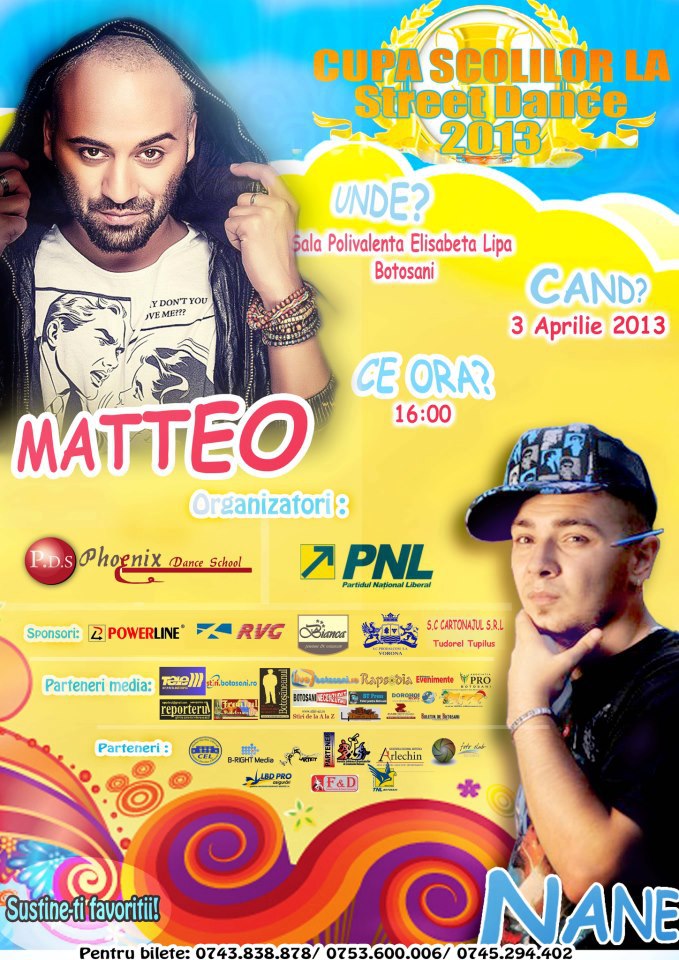 Matteo și-a anunțat fanii pe facebook că miercuri va veni la Botoșani pentru a fi alături de trupele care s-au înscris la prima ediție a concursului Cupa Școlilor la Street Dance din Botoșani. Artistul îl va înlocui pe CRBL deoarece acesta a anunțat că nu mai poate da curs invitației organizatorilor de a lua parte […]