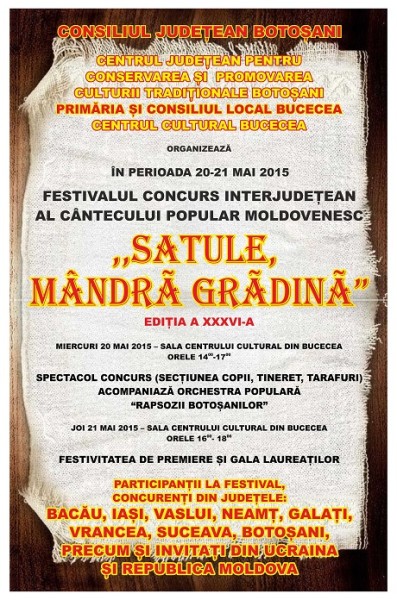 Centrul Judeţean pentru Conservarea şi Promovarea Culturii Tradiţionale Botoşani, sub patronajul Consiliului Judeţean Botoşani, Primăria şi Consiliul Local Bucecea, Centrul Cultural Bucecea, organizează Festivalul-concurs interjudeţean de interpretare a cântecului popular moldovenesc „SATULE, MÂNDRĂ GRĂDINĂ”, ediţia a XXXVI-a. Festivalul se va desfăşura în incinta Centrului Cultural din oraşul Bucecea în perioada 20 – 21 mai 2015. […]