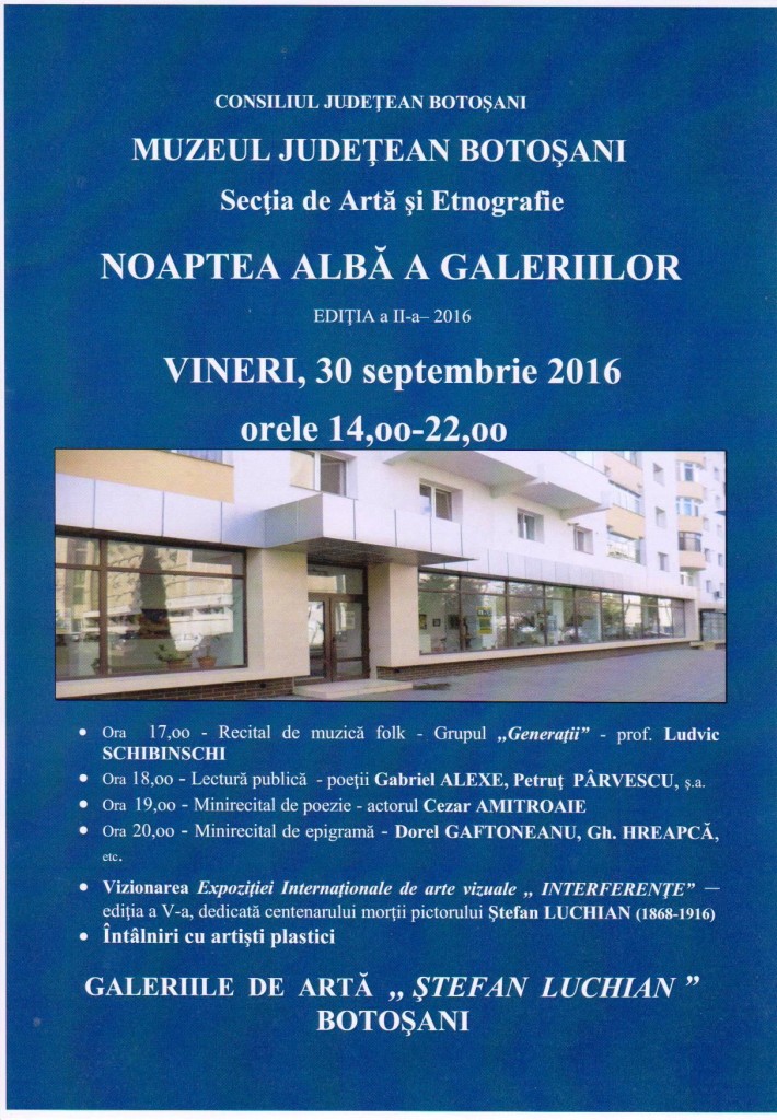 Muzeul Judeţean Botoşani organizează vineri, 30 septembrie, în spaţiul Galeriilor de Artă ,,Ştefan Luchian” Botoşani, evenimentul cultural ,,Noaptea albă a Galeriilor” – ediţia a II-a, între orele 17,oo – 22,oo. Iată programul: Ora 17,oo – Recital de muzică folk – Grupul ,,Generaţii” – prof. Ludvic SCHIBINSCHI Ora 18,oo – Lectură publică – poeţii Gabriel ALEXE, […]