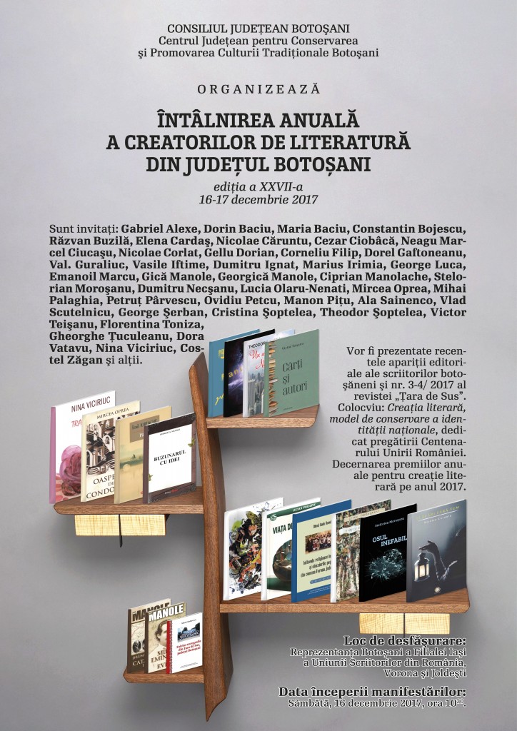 Consiliul Judeţean Botoşani, Centrul Judeţean pentru Conservarea şi Promovarea Culturii Tradiţionale Botoşani, organizează ”Întâlnirea anuală a creatorilor de literatură din județul Botoșani” ediţia a XXVII-a, 16-17 decembrie 2017. Manifestările prilejuite de întâlnire vor începe sâmbătă 16 decembrie ora 10.30 în sediul Reprezentanţei Botoşani a Filialei Iaşi a Uniunii Scriitorilor din România. Sunt invitaţi scriitorii: Gabriel […]