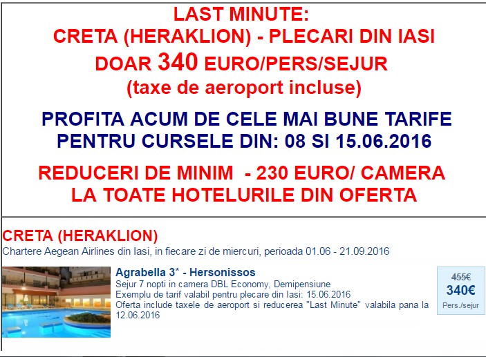 Iubitorii de soare și mare au parte de oferta verii de la agenția Kappa Turism. Agenția de turism oferă excursii last minute în datele de 8 și 15 iunie la prețuri începând de la 340 de euro de persoană pentru sejur în Creta. Plecarea se face cu avionul din Iași, iar taxele de aeroport sunt […]