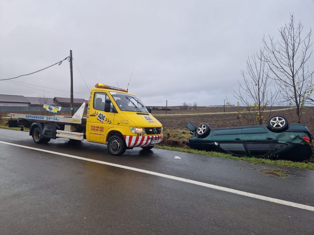 FOTO Accident! Mașină răsturnată în șanț. Primar acuzat că nu a intervenit pentru înlăturarea poleiului