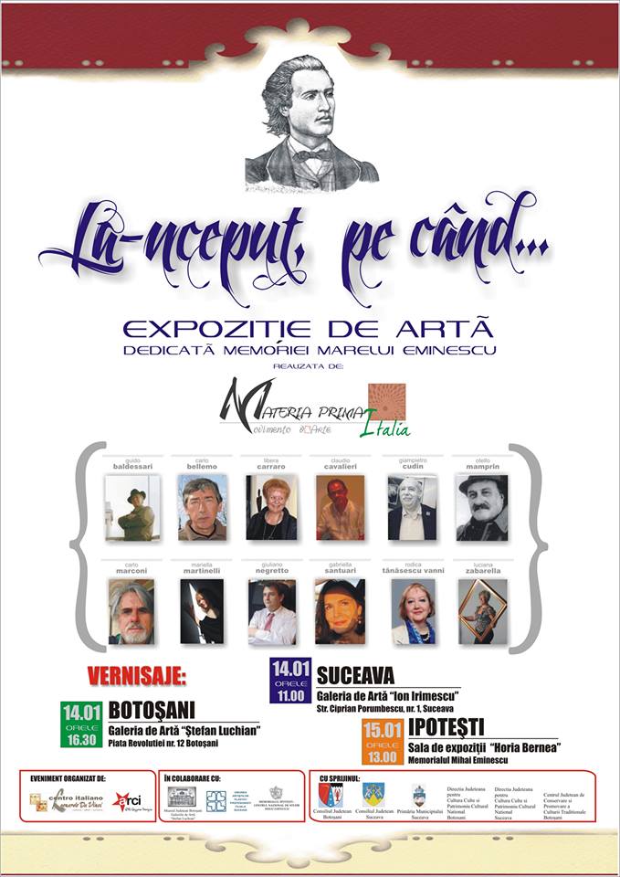 Muzeul Judeţean Botoşani găzduieşte, în perioada 14 – 31 ianuarie 2014, în spaţiul Galeriilor de Artă ,,Ştefan Luchian” Botoşani, expoziţia ,,La-nceput pe când …” eveniment cultural organizat de MATERIA PRIMA – MOVIMENTO D’ ARTE VENEŢIA, Centro Italiano „Leonardo da Vinci” şi ARCI 216 Gazzera -Venezia Expoziţia este dedicată memoriei poetului MIHAI EMINESCU. Participanţii sunt artişti […]