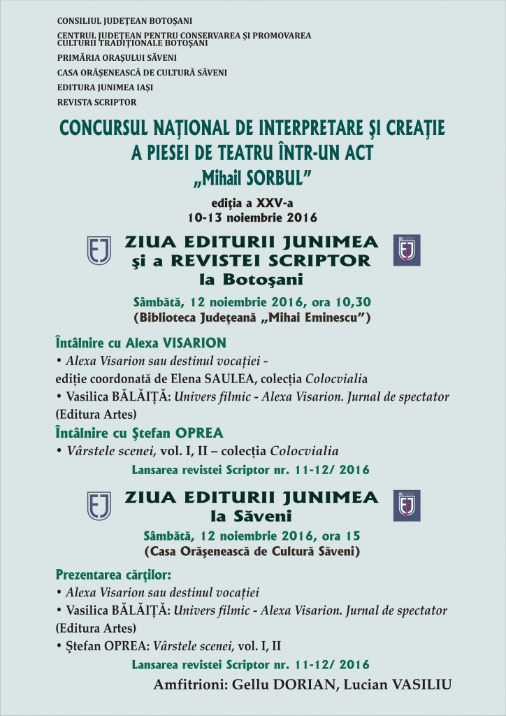 Consiliul Judeţean Botoşani, Centrul Judeţean pentru Conservarea şi Promovarea Culturii Tradiţionale Botoşani, Primăria Oraşului Săveni, Casa Orăşenească de Cultură Săveni, organizează în perioada 10-13 noiembrie 2016 la Botoşani şi Săveni, Concursul național de interpretare și creație a piesei de teatru într-un act ”Mihail Sorbul” edițiile a XXV-a (interpretare) şi a X-a (creaţie). Participă formaţii de teatru […]