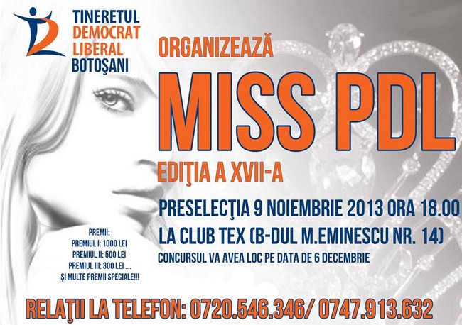 Organizaţia de Tineret PDL Botoşani continuă tradiţia concursului de frumuseţe MISS PDL, ajuns, anul acesta, la cea de-a XVII-a ediţie. Evenimentul se va desfăşura pe data de 6 decembrie, începând cu ora 18.00, la Club Tex din Bulevardul Mihai Eminescu nr. 14 (lângă Spitalul de Copii). Tot la club Tex va avea loc şi preselecţia […]
