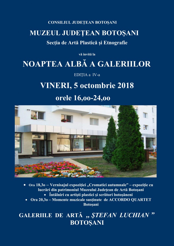Muzeul Judeţean Botoşani organizează vineri, 5 octombrie 2018, în spaţiul Galeriilor de Artă ,,Ştefan Luchian” Botoşani, evenimentul cultural ,,Noaptea albă a Galeriilor” – ediţia a IV-a, între orele 16,oo – 24,oo, cu următorul program: Ora 18,3o – Vernisajul expoziției ,, Cromatici autumnale” – lucrări din patrimoniul Muzeului Județean Botoșani Întâlniri cu artiști plastici și scriitori […]