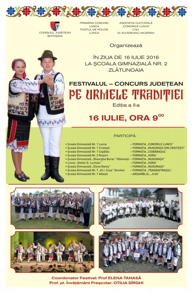 Sâmbătă, 16 iulie 2016, începând cu ora 900 , va avea loc festivalul concurs-judeţean „Pe urmele tradiţiei”, ediţia a II-a. Evenimentul se va desfăşura la Şcoala Gimnazială Nr. 2 Zlătunoaia din satul Zlătunoaia, comuna Lunca. Acest proiect este realizat cu sprijinul Consiliului Judeţean Botoşani. La festival vor participa formaţii, solişti vocali şi instrumentişti de la […]