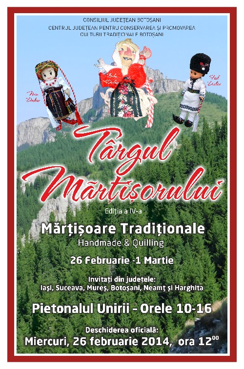 Centrul Judetean pentru Conservarea si Promovarea Culturii Tradiționale Botoșani,în perioada 26 februarie – 1 Martie,organizează Târgul Martișorului, Editia a IV a, 2014 unde vor participa meșteri populari invitați din județele Iași, Suceava, Mureș, Harghita, Neamț si Botoșani. O parte a acestora a dezvoltat preocuparea de a confecționa aceste talismane, legate de trezirea la viata a […]