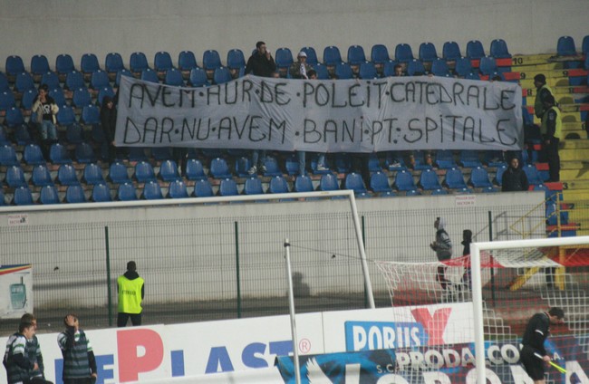 Meciul dintre FC Botoşani şi ACS Poli Timişoara a început cu un moment de reculegere, dar şi cu afişarea unui banner împotriva Bisericii Ortodoxe. Mai mulţi suporteri din peluza sud au afişat un mesaj referitor la discrepanţa dintre averea Bisericii şi numărul de spitale din România. „Avem aur de poleit catedrale, dar nu avem bani […]