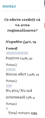 Mai mult de jumătate dintre botoşăneni cred că regionalizarea va produce efecte negative, potrivit unui sondaj realizat, în perioada 19- 25 august, de BotosaniNews. La întrebarea „Ce efecte credeţi că va avea regionalizarea?” au răspuns 134 de persoane, iar dintre acestea 59, adică 59%, cred că efectele vor fi negative. Doar 32 dintre respondenţi (adică […]