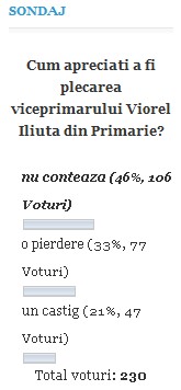 Plecarea, prin demisie, a viceprimarului Viorel Iliuţă din Primaria municipiului Botosani nu conteaza prea mult pentru botosaneni, releva un sondaj realizat, in perioada 15- 21 iulie, de BotosaniNews. La intrebarea „Cum apreciati a fi plecarea viceprimarului Viorel Iliuta din Primarie?” au raspuns 230 de cititori, iar dintre acestia 46%, adica 106, au raspuns ca „nu […]