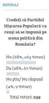 Majoritatea botoşănenilor este sceptică în ceea ce priveşte viitorul Mişcării Populare pe scena politică din România, potrivit unui sondaj de opinie realizat în perioada 29 iulie- 4 august. La întrebarea „Credeţi că Partidul Mişcarea Populară va reuşi să se impună pe scena politică din România?” au răspuns 239 de cititori, iar dintre aceştia 163, adică […]