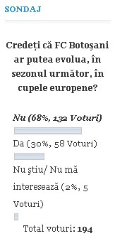 Botoşănenii sunt sceptici în ceea ce priveşte posibilitatea ca FC Botoşani să joacă, anul viitor, în cupele europene, relevă un sondaj realizat, în perioada 26 august- 1 septembrie. La întrebarea Credeţi că FC Botoşani ar putea evolua, în sezonul următor, în cupele europene? au răspuns 194 de cititori, iar dintre aceştia 68%, adică 132, au […]