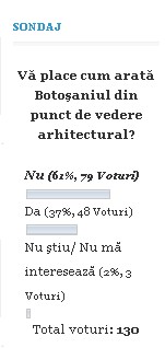 Locuitorii Botoşaniului sunt nemulţumiţi de arhitectura localităţii, potrivit unui sondaj realizat, în perioada 23-29 septembrie, de BotosaniNews. La întrebarea Vă place cum arată Botoşaniul din punct de vedere arhitectural? au răspuns 130 de cititori, iar dintre aceştia 79, adică 61% au dat răspuns negativ. Doar 37% dintre respondenţi apreciază modul în care s-a construit în Botoşani. […]