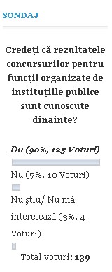 90% dintre botoşăneni consideră că locurile de muncă de la stat sunt „aranjate”, relevă un sondaj realizat, în perioada 16- 22 septembrie, de BotosaniNews. La întrebarea Credeţi că rezultatele concursurilor pentru funcţii organizate de instituţiile publice sunt cunoscute dinainte? au răspuns 139 de cititori, iar dintre aceştia 125, adică 90%, au răspuns afirmativ, în timp […]