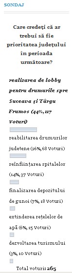 70% dintre botoşăneni consideră că prioritatea judeţului ar trebui să fie, în acest moment, refacerea drumurilor, potrivit unui sondaj realizat, în perioada 2-8 iulie, de BotosaniNews. La întrebarea Care credeţi că ar trebui să fie prioritatea judeţului în perioada următoare? au răspuns 265 de cititori, iar dintre aceştia 44% (117 respondenţi) susţin eă este nevoie […]