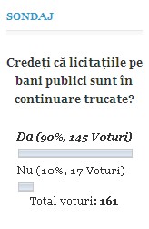 Nu mai puţin de 90% dintre botoşăneni consideră că licitaţiile publice organizate de autorităţile locale sunt trucate, potrivit unui sondaj realizat, în perioada 21- 26 august, de BotosaniNews. La întrebarea Credeţi că licitaţiile pe bani publici sunt în continuare trucate? au răspuns 161 de cititori, iar dintre aceştia 145 (90%) au răspuns „Da” şi doar […]