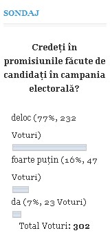 Trei sferturi dintre botoşăneni nu au încredere în promisiunile electorale, relevă un sondaj realizat, în perioada 26 noiembrie- 2 decembrie. La întrebarea Credeţi în promisiunile făcute de candidaţi în campania electorală? au răspuns 302 cititori, iar dintre aceştia nu mai puţin de 232, adică 77%, susţin că nu au deloc încredere în promisiunile politicienilor. Totodată, 47 […]