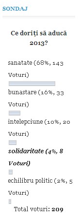 Majoritatea botoşănenilor îşi doresc ca anul 2013 să le aducă, în principal, sănătate, potrivit unui sondaj realizat, în perioada 2-6 ianuarie, de BotosaniNews. La întrebarea „Ce doriţi să aducă 2013?” au răspuns 209 cititori, iar dintre aceştia 143, adică 68%, au răspuns că au nevoie de sănătate, în timp ce 33 de respondenţi (16%) spun că […]