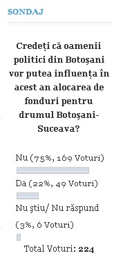 Trei sferturi dintre botoşăneni nu au încredere că politicienii din Botoşani vor obţine finanţare pentru drumul Botoşani- Suceava, potrivit unui sondaj realizat, în perioada 28 ianuarie- 3 februarie. La întrebarea „Credeţi că oamenii politici din Botoşani vor putea influenţa în acest an alocarea de fonduri pentru drumul Botoşani- Suceava?” au răspuns 224 de cititori, iar […]