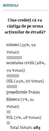 Protestele de stradă din ultimele două săptămâni nu aduc niciun câştig. Cel puţin sta cred cei mai mulţi dintre participanţii la un sondaj realizat, în perioada 23-29 ianuarie, de BotosaniNews. La întrebarea „Cine credeţi că va câştiga de pe urma acţiunilor de stradă?” au răspuns 283 de cititori, iar dintre aceştia 99 (adică 35%) au […]