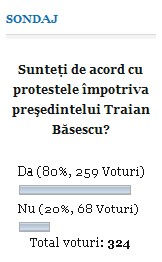 Nu mai puţin de 80% dintre botoşăneni susţin protestele de stradă, potrivit unui sondaj de opinie realizat, în perioada 16-22 ianuarie, de BotosaniNews. La întrebarea „Sunteţi de acord cu protestele împotriva preşedintelui Traian Băsescu?” au răspuns 324 de cititori, iar dintre aceştia nu mai puţin de 259 (80%) au răspuns pozitiv. În acelaşi timp, 68 […]