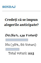 Majoritatea botoşănenilor doresc alegeri anticipate, potrivit unui sondaj realizat, în perioada 30 ianuarie- 5 februarie, de BotosaniNews. La întrebarea „Credeţi că se impun alegerile anticipate?„ au răspuns 225 de persoane, iar dintre acestea 139, adică 62%, s-au pronunţat în favoarea alegerilor anticipate. În acelaşi timp, 86 de persdoane, adică 38%, consideră că alegerile anticipate nu sunt o soluţie. […]