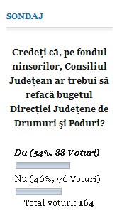 Bugetul Direcţiei Judeţene de Drumuri şi Poduri Botoşani ar trebui rectificat, potrivit unui sondaj realizat, în perioada 6-12 februarie, de BotosaniNews. La întrebarea Credeţi că, pe fondul ninsorilor, Consiliul Judeţean ar trebui să refacă bugetul Direcţiei Judeţene de Drumuri şi Poduri? au răspuns 164 de persoane, iar dintre acestea 54%, adică 88, consideră că este […]