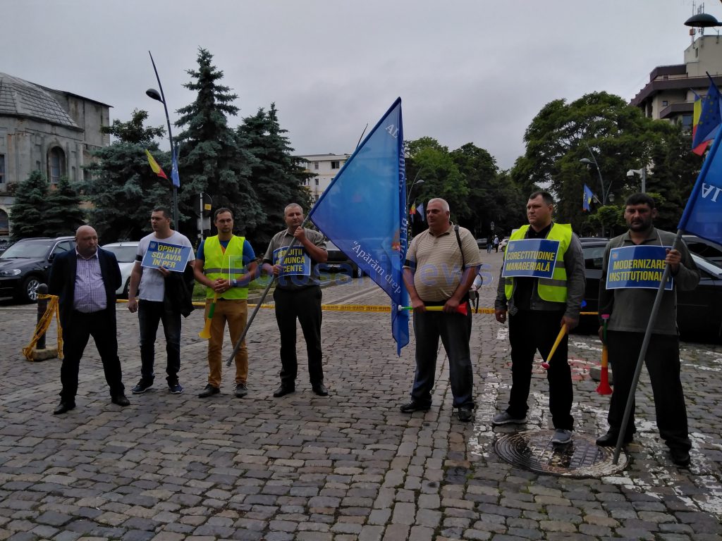 Peste 10 angajați ai Poliției de Frontieră Botoșani au protestat, marți, în fața Instituției Prefectului. Ei au purtat banderole negre