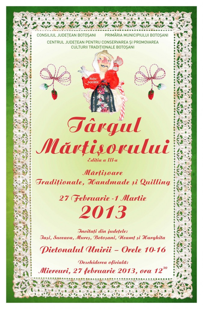 Centrul Judetean pentru Conservarea si Promovarea Culturii Tradiționale Botoșani,în perioada 26 februarie – 1 Martie,organizează Târgul Martișorului, Editia a IV a, 2014 unde vor participa meșteri populari invitați din județele Iași, Suceava, Mureș, Harghita, Neamț si Botoșani. O parte a acestora a dezvoltat preocuparea de a confecționa aceste talismane, legate de trezirea la viata a […]
