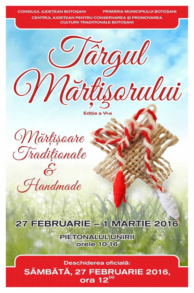 Centrul Judeţean pentru Conservarea si Promovarea Culturii Tradiţionale Botoşani, în perioada 27 februarie-1 Martie, organizează Târgul Marţişorului-Editia a VI-a, 2016. Finalitatea acestei manifestări, prin prezentarea expoziţiilor cu vânzare, şi-a propus readucerea în conştiinţa vizitatorilor sau cumpărătorilor a conotaţiilor legate de acest simbol al primăverii cu o deosebită complexitate în cultura noastră populară. În acest sens, […]