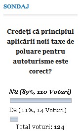 Majoritatea botoşănenilor nu sunt de acord cu modalitatea de stabilire a noii taxe auto, potrivit unui sondaj realizat, în perioada 9-15 ianuarie, de BotosaniNews. La întrebarea Credeţi că principiul aplicării noii taxe de poluare pentru autoturisme este corect? au răspuns 124 de cititori, iar dintre aceştia nu mai puţin de 110, adică 89%, s-au pronunţat împotrivă. […]