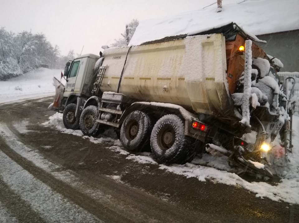 FOTO Maşină de la deszăpezire, blocată într-un şanţ de pe marginea unui drum judeţean