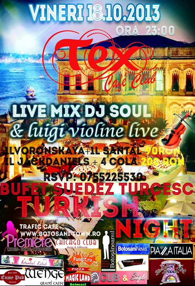 Tex Club Cafe Botoșani anunţă pentru vineri o noapte incendiară, veritabil turcească. Începând cu orele 23.00 Tex Club Cafe aşteaptă clienţii să intre într-o lume plină de mister și senzații, în care arta muzicii orientale se îmbină cu cotidianul într-o armonie perfectă, alături de DJ Soul și Luigi – Violin Man, învăluiți în parfumul senzual […]