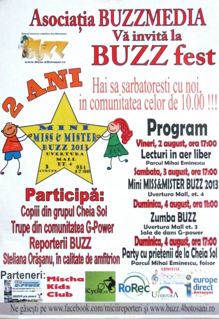 Vineri, 2 august, încep manifestările BUZZfest, organizate cu scopul de a aniversa doi ani de existență ai clubului de jurnalism “Micii reporteri”. Startul activităților propuse pentru cea de-a doua ediție, la care sunt invitați să ia parte toți copiii din Botoșani, dar și părinții și bunicii lor, va fi dat vineri, ora 17.00, în parcul […]
